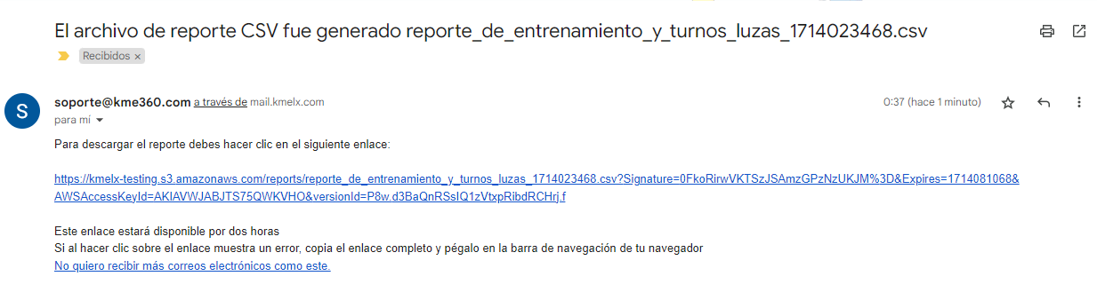 Para descargar el reporte de turnos, selecciona el botón "Descargar Reporte de Entrenamiento". Recibirás una notificación con un enlace para descargar el reporte.