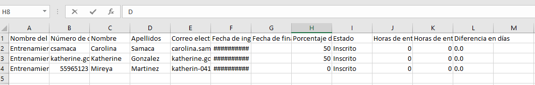 - Estado: Muestra el estado actual del participante en el entrenamiento. Podría incluir estados como "En progreso", "Completado", "Pendiente" o "Cancelado".